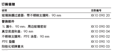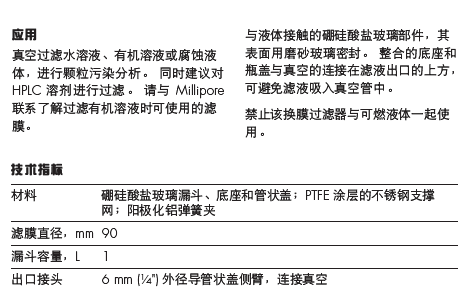 真空过滤水溶液、有机溶液或腐蚀液体,进行颗粒污染分析。 同时建议对 HPLC 溶剂进行过滤。 请与 Millipore 了解过滤有机溶液时可使用的滤膜。 与液体接触的硼硅酸盐玻璃部件,其表面用磨砂玻璃密封。